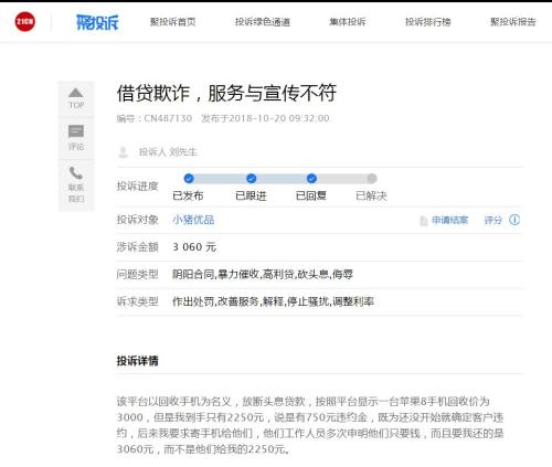 “还没开始就确定客户违约,后来我要求寄手机给他们,他们工作人员多次申明他们只要钱,而且要我还的是3060元,而不是他们给我的2250元。”该用户称。