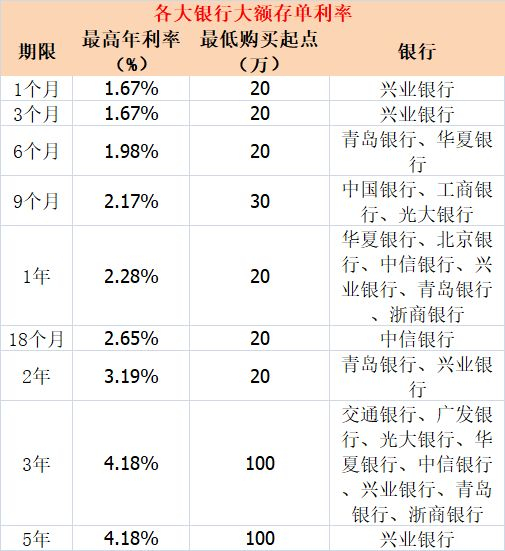 大额存单的利率会因不同银行和不同地区的差异有所浮动,根据记者不完全统计,最新情况是1月期、3月期最高年利率为1.67%,6个月最高年利率为1.98%,1年期最高年利率为2.28%,2年期最高年利率为3.19%,3年期、5年期最高年利率为4.18%。