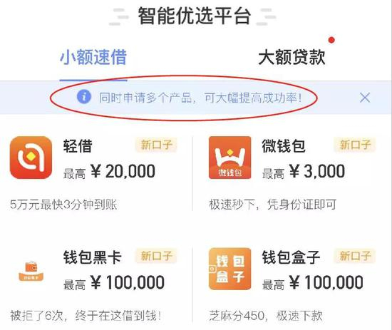 据了解,除了“提钱游”、同程金服还设立了贷款超市,为万达普惠、闪贷、微钱包等平台提供导流服务,多个现金贷平台并无任何借款资质。同程金服页面显示,“同时申请多个产品,可大幅提高成功率”,涉嫌诱导用户多头借贷。