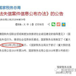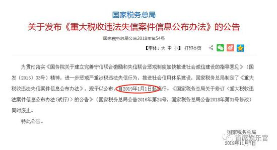 按照国家税务总局出台的《关于进一步规范影视行业税收秩序有关工作的通知》(以下简称《通知》),目前正处于第一阶段即自查自纠阶段(10月10日-12月底前)。就在影视圈忙着补缴税款时,11月7日,国家税务总局又公布了《关于发布<重大税收违法失信案件信息公布办法>的公告》,该《重大税收违法失信案件信息公布办法》(以下简称《办法》),将在2019年1月1日起施行。