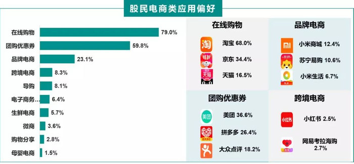 电商类应用中,在线购物、团购优惠券、品牌电商以及跨境电商分列股民偏好前四位。其中淘宝是在线购物App绝对霸主,美团是团购首选,小米商城以及小米生活分列品牌电商第一、第三。