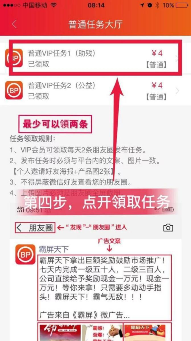 会员每天可领取两条任务,即每天发两条朋友圈赚取8元的收益。此外,会员分享邀请他人成为霸屏天下的会员(一级)可赚取8元,一级会员分享邀请他人成为霸屏天下的会员(二级),仍可赚取8元。一级会员、二级会员发朋友圈,你分别能分得4元和2元。
