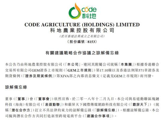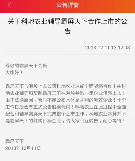 12月11日,霸屏天下发布公告,称与港股上市公司科地农业(08153.HK)达成战略合作,后者将辅导和帮助公司在港股并购一家企业借壳上市。根据科地农业12月10日发布的战略合作协议之谅解备忘录,确实拟与霸屏天下合作,但合作内容仅有成立跨境电商,并无辅导其借壳上市。