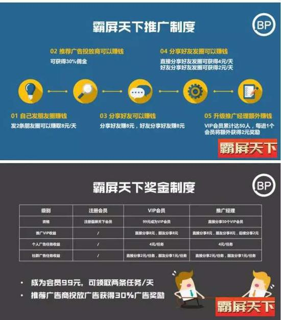 按照霸屏天下的宣传口径,平台一端对接广告商发布广告,一端对接会员——花99元成为会员,就能通过朋友圈发布任务,获取商家佣金。其推广和奖金制度如下图: