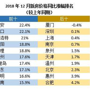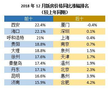 国家统计局公布的2018年12月份70个大中城市住宅销售价格统计数据显示,西安新房价格同比去年上涨22.4%,涨幅排名第一;而厦门则成为70个城市中,唯一一个新房价格比去年低的城市。
