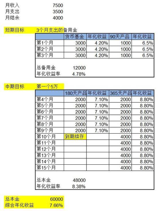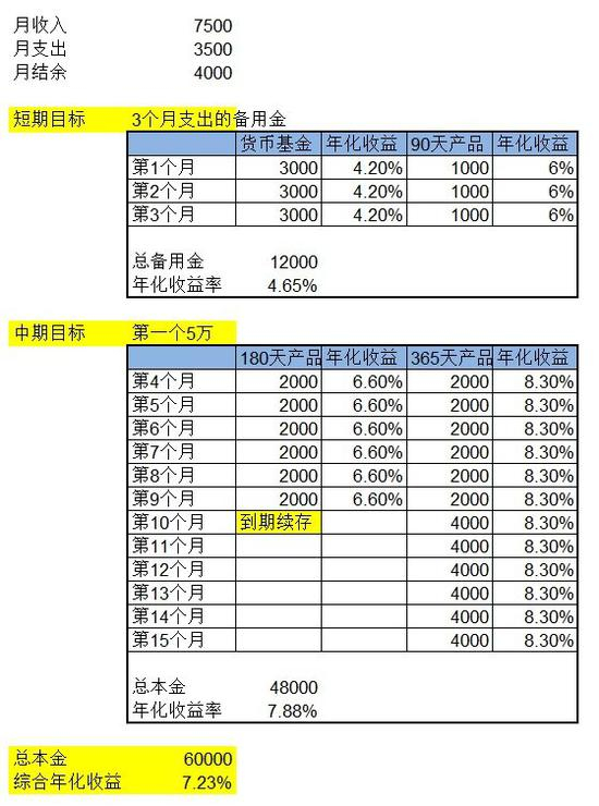 方案介绍:180天产品存够6单之后可以停止,因为这时候第一笔180天已经到期,续存即可,这时的月结余可以存入365天产品,提高年化收益率。这样下来,在第15个月后,365天产品也开始循环,也基本实现第二阶段的攒钱目标“第一个5万”。这时候,一共积累了6万本金,综合年化收益率7.23%,并且,每月可以随时取用的现金=9000备用金货币基金+1000备用金里的90天产品+2000元180天产品+2000元365天产品=14000元,基本可以兼顾流动性和收益率。