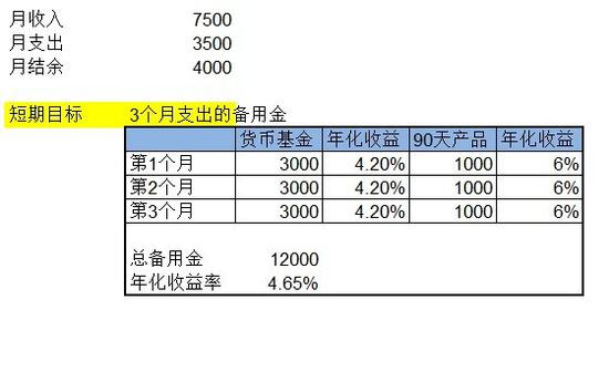 方案介绍:攒钱周期是3个月,因此可以规划一部分资金放入90天产品(即3单,3个月到期后开始实现循环),这样,大概3个月后,mm每个月随时可以取用的钱大概是9000元货币基金+1000元到期90天产品=10000元,大约是mm三个月的生活支出,应急是够了。