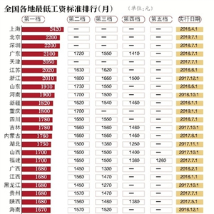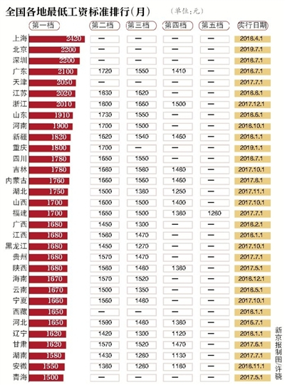 2018年以来,全国已至少有上海、广东、北京、江苏、山东、河南、新疆、四川、江西、广西、云南、西藏、辽宁等13个省份先后提高最低工资标准。据人社部官网公布的相关数据显示,上海、广东、北京、天津、江苏、浙江6个省份的最低工资超过了2000元。