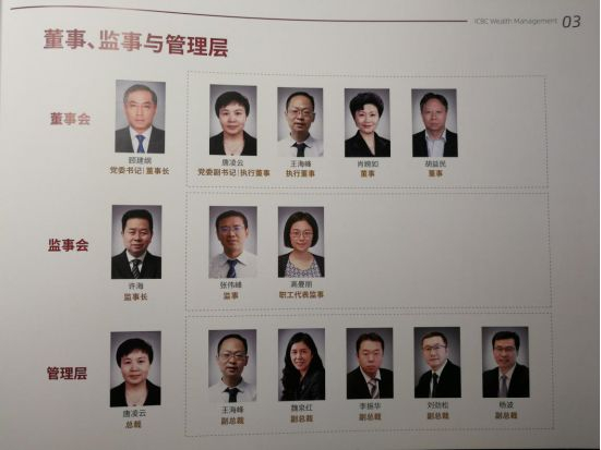 产品营销板块、投资研究板块、风险管理板块、运营支持板块、综合管理板块,总共包含20个部门。原工商银行资产管理部总经理顾建纲任董事长,许海任监事长,原金融市场部兼同业业务部负责人唐凌云出任总裁。