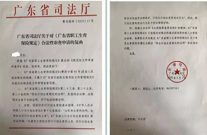 2019年7月5日,她收到广东省司法厅的回复,回复函中表明,目前我国仍然实行计划生育的基本国策,超计划生育的违法行为不受法律保护的。《广东省职工生育保险规定》关于享受生育保险待遇应当提供“符合计划生育规定的证明”并不存在违法问题。这也意味着,从法律政策上来说,在广东非婚生育的妈妈依然不能拿到自己的生育保险。