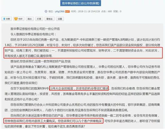 根据投资者在网上的公开信内容,指出华泰证券在销售该产品时,在路演材料中,以“伟大企业的摇蓝”、“历史性的机会”等词汇描述,并且指出,有销售人员声称有内部员工大量购买。