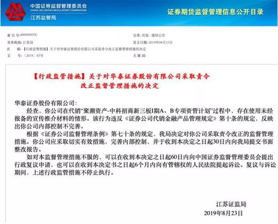8月26日,江苏证监局发布公告称,经查,华泰证券在代销“聚潮资产-中科招商新三板I期A、B专项资管计划”过程中,存在使用未经报备的宣传推介材料的情形。该行为违反《证券公司代销金融产品管理规定》第十条的规定,反映出公司内部控制不完善,决定对华泰证券采取责令改正的监督管理措施。