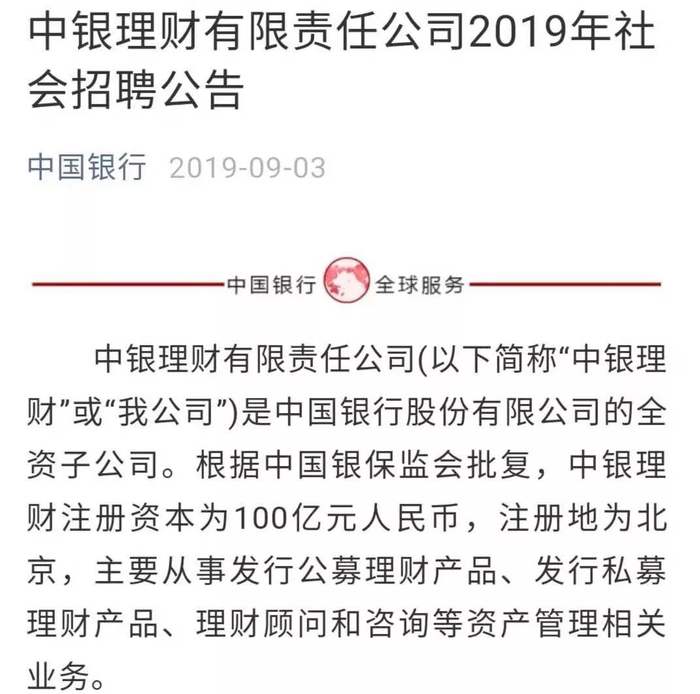 9月3日,中国银行发布关于中银理财公司2019年社会招聘公告,这是已开业的理财子公司中首个发布社招的公司。