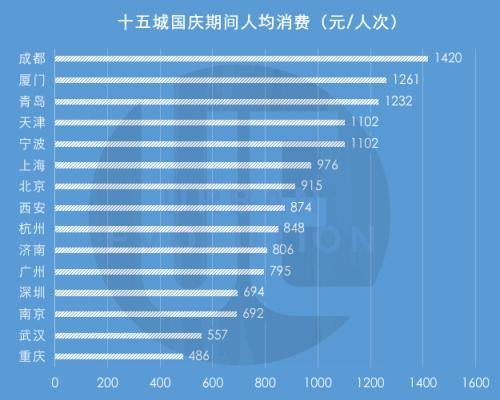 这其中,成都以人均消费1420元/人次摘得桂冠,且与第二位青岛的1232元/人次拉开较大差距。西安虽未破千元,但以874元/人次的成绩,也可力压杭州与广州。而武汉和重庆则分为500元/人次上下,居于末端。