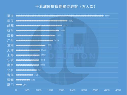 目前城叔统计的北京、上海、广州、深圳、天津、济南、青岛、杭州、南京、宁波、武汉、成都、重庆、西安、厦门十五座城市中,国庆期间接待游客人次最高的前五为城市分别是: