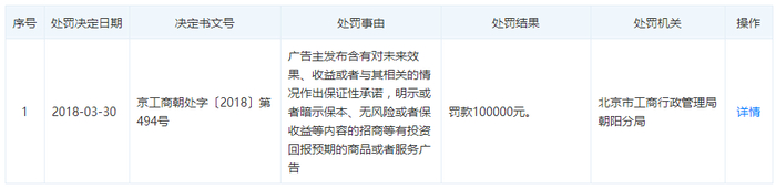 另外,在去年3月30日,邦帮堂因发布含有对未来效果、收益或者与其相关的情况作出保证性承诺,明示或暗示保本、无风险或者保收益等内容的招商等有投资回报预期的商品或者服务广告,被北京市工商行政管理局朝阳分局罚款10万元。