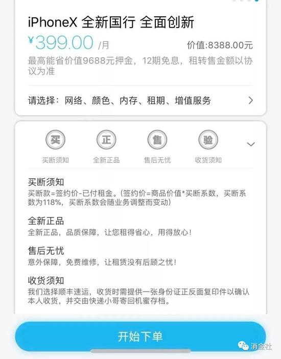 比如手机租赁,一部新的iPhone X,如果是分期购买,最终支付本金加利息近万元。但如果是租赁,按照某租赁平台的价格,每个月只需要付399元租金费。
