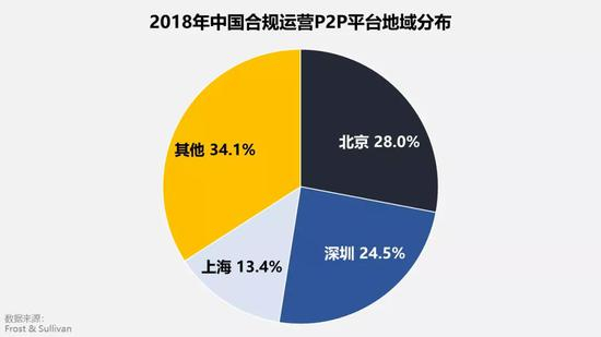 从具体的地区分布来看,中国P2P借贷平台主要分布在北京、深圳、上海等一线城市,2018年底北上深三地的P2P合规运营平台数占到65.9%左右。