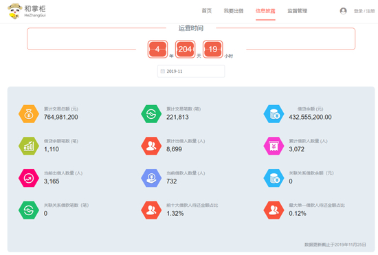 与注册用户数极不相符的是,和掌柜累计借款人只有3072人,当前借款人仅700人;累计出借人也只有8699人,当前出借人3165人,借款余额4.33亿元。令人不解的是,公司首页和信息披露详情页的累计交易总额,出现了巨大的差异,首页累计交易总额为53.24亿,详情页累计交易总额为7.65亿。