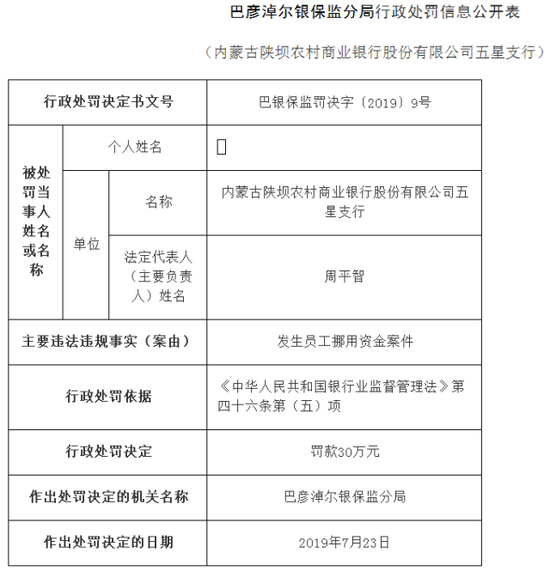 2019年8月9日,银保监网站公布的巴彦淖尔银保监分局行政处罚信息公开表(巴银保监罚决字〔2019〕9号)显示,陕坝农商行五星支行发生员工挪用资金案件,巴彦淖尔银保监分局对其处以罚款30万元。