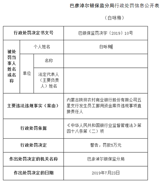 此外,当事人白咏梅是陕坝农商行五星支行发生员工挪用资金案件违规事项直接责任人,巴彦淖尔银保监分局对其处以警告,罚款5万元。