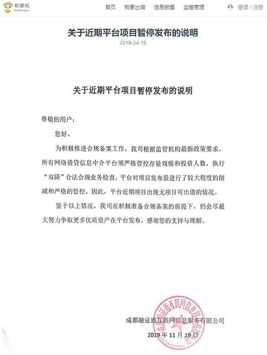 2019年11月19日,和掌柜发布了《平台项目暂停发布的说明》,称为执行“双降”合法合规业务检查,平台对项目发布量进行了较大程度的削减,因此平台近期出现无项目可出借的情况。