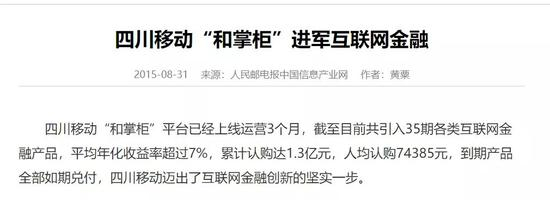 2015年5月,和掌柜上线运营,上线3个月后,就已引入35期各类互联网金融产品,平均年化收益率超过7%,累计认购达1.3亿元,人均认购74385元。在当时的宣传口径中,和掌柜被称为“四川移动和掌柜”,是四川移动迈向互联网金融创新的重要举措。