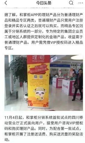 而四川移动的对外宣传,也与内部邮件所提供的的信息一致,一篇对外推广的文章显示,四川移动营业厅是和掌柜分销系统的首批试点。据了解,和掌柜APP的理财产品分为普通理财产品和精品专区两类,普通理财产品只需用户注册登录并实名认证之后就可以购买,而精品专区则属于分销系统的一部分,专为特定的集团企业员工或地区人群提供定制化的金融产品,收益高于普通理财产品。用户需凭借VIP授权码进入精品专区。
