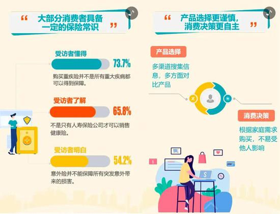 调研显示,大部分保险消费者具备一定的保险常识,如73.7%的受访者懂得购买重疾险并不等于所有重大疾病都能得到保障,65.8%的受访者了解不是只有人寿保险公司才可以销售健康险等。
