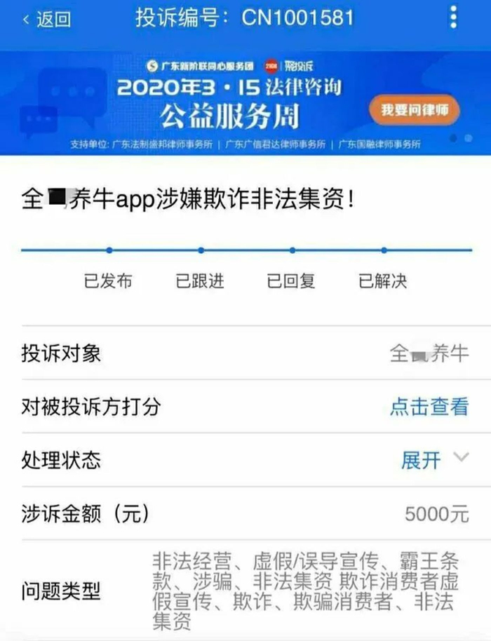 农x牧业不是第一个养牛APP。除了农x牧业,还有全x养牛、奔x富牧业、牛x萌全民养殖、x牧宝等,其中全x养牛APP是最早做互联网养牛的平台,也因非法集资被不断投诉,被人撵着扒底裤: