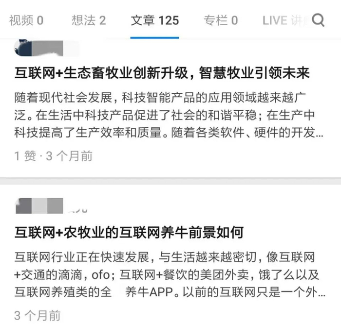 像这位老兄,不遗余力地在知乎发了125篇云养殖的文章,俨然是一个权威的云养牛行业自媒体: