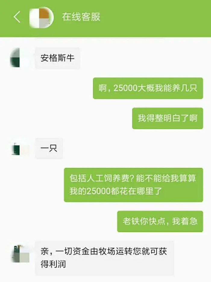 但我加了全x老哥微信私聊后,询问5000块具体用来购买什么、牛犊的价格和成牛的价格,以及人工费、饲料费大概占据多少时,老哥却和华x一样含糊其辞:“我们全程照顾,您不用操心。”“不管行情多低,都保证您最少有10%的利润率。”就不再理我了。
