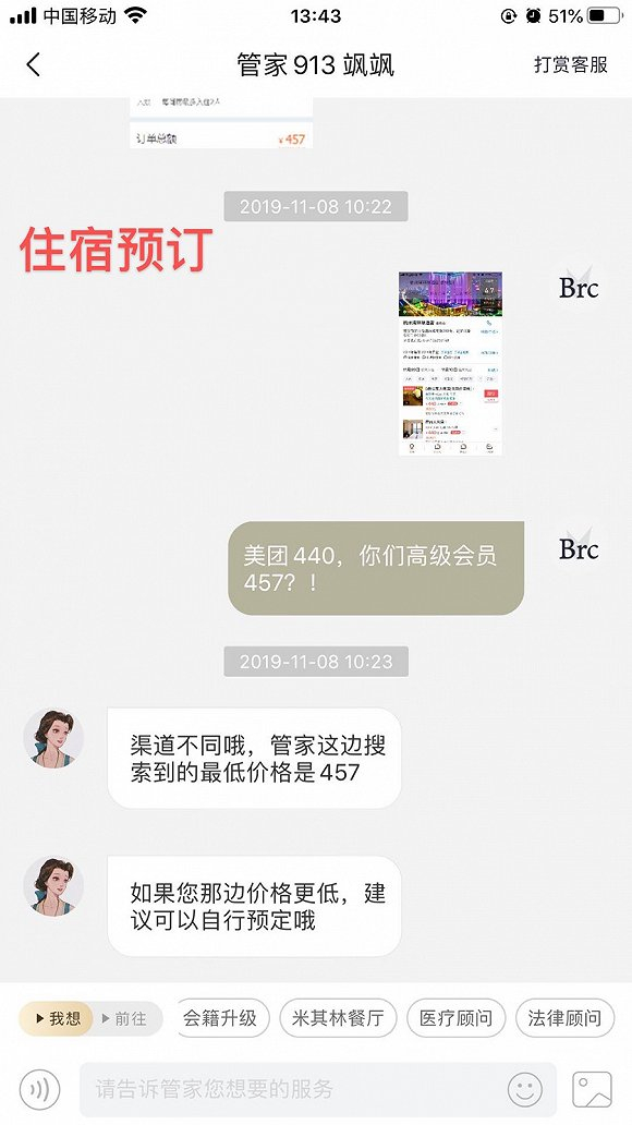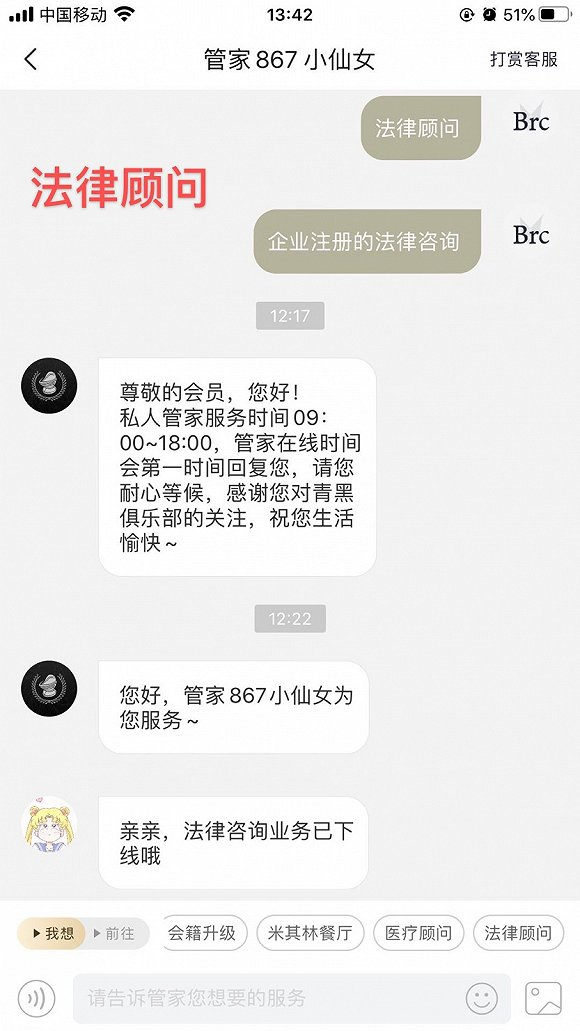 “我收到卡以后,一次都没消费过。”据李女士介绍,通过青黑俱乐部管家询价,发现该平台提供的酒店和机票预订服务的价格比其他OTA网站更高,小型演出门票预订价格也比其它网站贵不少。平台承诺的免费贵宾厅服务需要从青黑购买机票才可以安排使用,与宣传不符。此外,免费法律顾问服务、签证速办服务等直接被否认存在。