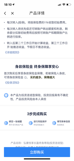 产品介绍看到这里,如果不是金融专业人士,可能并不了解这款产品的属性。一直往下拉到《转入规则》,才能看到滴滴的提示,“每次转入(投保),将按保险费的1%收取初始费用。”