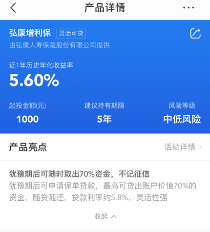 苏宁金融在保单贷方面的信息披露比滴滴好很多。显要位置出现“犹豫期后可随时取出70%资金,不记征信“,”犹豫期后可申请保单贷款,最高可贷出账户价值70%的资金,随贷随还,贷款利率约5.8%,灵活性强。“