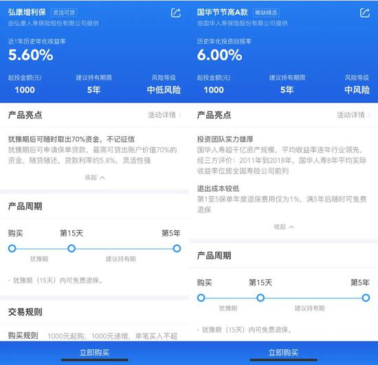 无独有偶,苏宁金融的“定期理财”页面下也有两款投连险产品,分别为“国华节节高A款”,宣传“5年、1000元起投、退保费低”,历史年化收益率为6.00%;“弘康增利保”则宣传“5年、1000元起投、灵活可贷”,历史年化收益率5.60%。其中,宏康增利保的风险等级为“中低风险”,国华的产品则为“中风险”。
