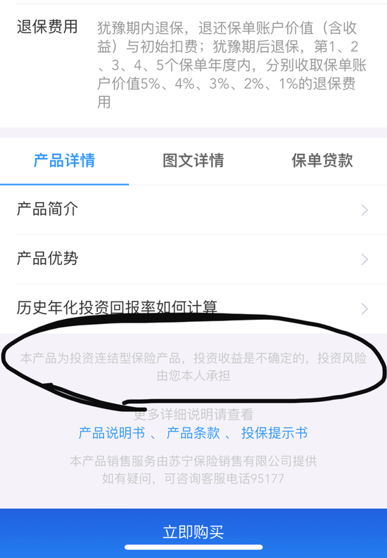 苏宁金融的“弘康增利保”,背后是弘康长乐泰两全保险(投资连接型),在风险提示上也做的不够。仅在产品详情最底部,用灰色字体提示“投资收益是不确定的,投资风险由您本人承担。