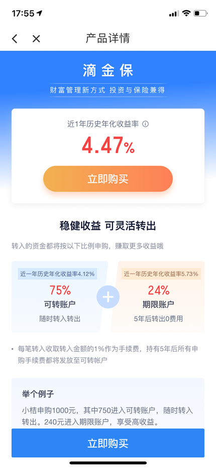 滴滴金融称,该产品75%可转账户,随时转入转出,24%为期限账户,5年后转出0费用。但每笔转入收取1%的手续费。滴滴还给客户举了个申购1000元的例子,称在此模式下可“享受高收益“。