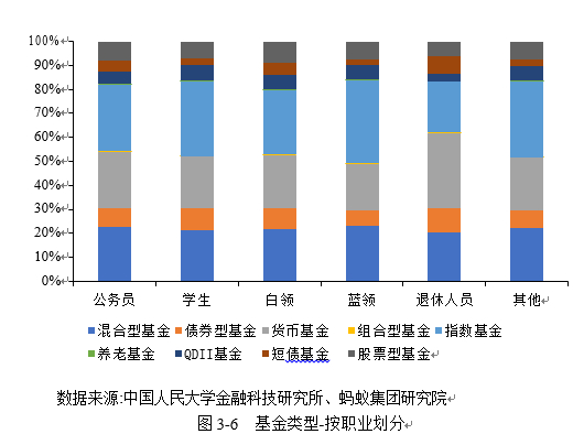 从职业分布来看,白领用户的基金产品投资最为均衡,且对风险较高的基金产品投资比重也较高;而学生及蓝领用户更愿意投资被动型基金,指数基金的占比较高;退休人员更偏好货币型基金(见图 3-6)。