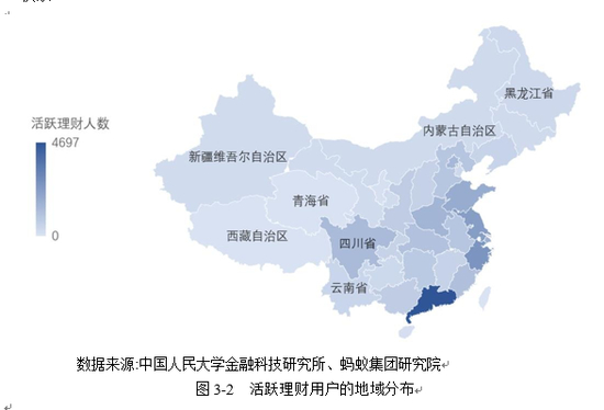逐级递减的趋势。其中,广东省的活跃人数最多,其次是江浙地区(见图 3-2)。一定程度上,活跃理财用户数量与地区经济发达程度、个人收入水平均有着紧密联系。