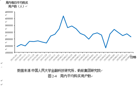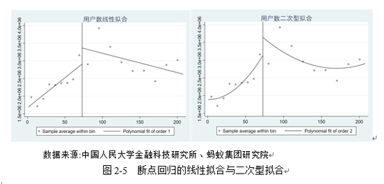根据蚂蚁集团提供的 2019 年 11 月至 2020 年 6 月线上交易用户数据,我们将 2020 年 1 月 19 日作为断点,进行断点回归分析,研究疫情前后个人购买理财产品行为的变化4。图 2-4 为 2019 年 11 月至 2020 年 6 月每 7 天购买理财产品用户数的日平均值,图 2-5 为将断点日期设为 1 月 19 日的线性拟合和二次型拟合结果。结果表明,疫情爆发之后,每日购买线上理财产品的用户数整体上升,尤其在疫情爆发初期有明显增长趋势,随着疫情趋于缓和,用户数仍较疫情前更高。居民线上理财意识逐渐提升,线上理财群体进一步扩大。