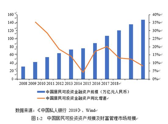 近年来,我国不断攀升的居民家庭财富规模为财富管理的需求扩张奠定了坚实基础。2008 年至 2018 年的十年间,我国实际国内生产总值(GDP)从 4.59 万亿美元增长至 13.89 万亿美元(见图 1-1)。尽管近年来经济增长速度减缓,但是财富积累作为存量受增速影响较小,同期内,我国居民可投资金融资产总规模随之扩大,从 2008 年的 31 万亿元人民币快速增长至 2018 年的 147 万亿元人民币 (见图 1-2),增长了 3.7 倍。