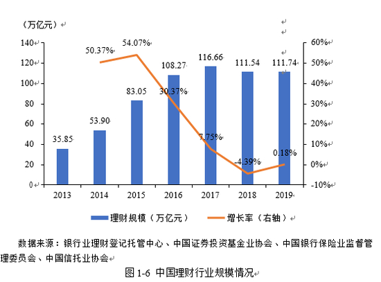 从理财规模2来看,我国理财行业呈先增后减的两个发展阶段。其中,2013 年至 2017 年为迅猛发展阶段,从 2013 年的 35.85 万亿元增长到 2017 年的 116.66 万亿元,四年来增长了 2.3 倍,年复合增长率高达 34.6%。2018 年起,我国理财总规模进入下行趋稳阶段,2018 年理财总规模下降为 111.54 万亿元,同比下降4.39%,2019 年资管总规模为 111.74 万亿元,同比小幅增长 0.18%。