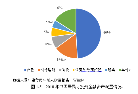 进一步地,我们对 2018 年我国居民的金融资产配置结构进行分析(见图 1- 5),结果发现,在 2018 年我国居民可投资金融资产的配置中,银行存款占据 49%,成为居民配置资产的首要选择,其次为银行理财,而居民对于股票及券商资管类