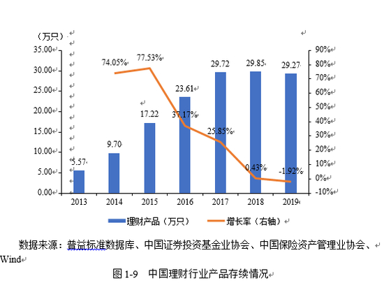 从理财产品3来看,我国理财产品存续量同样表现出先增后减的趋势。其中,2013 年为资管行业起步阶段,2014 年至 2017 年为迅猛增长阶段,2018 年至今为下行趋稳阶段。数据显示,我国理财行业产品存续总量从 2013 年的 5.57 万只增长到 2017 年的 29.72 万只,四年来增长了 4.3 倍。2018 年理财产品存续总量增速急剧下降,2019 年,理财产品总量为 29.27 万只,同比下降 1.92%。