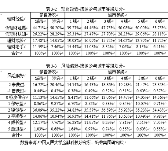 如表 3-3 所示,从风险偏好来看,涉农用户的风险偏好等级普遍低于城市用户,而城市投资者的风险偏好等级也随着城市级别的下降而递减。