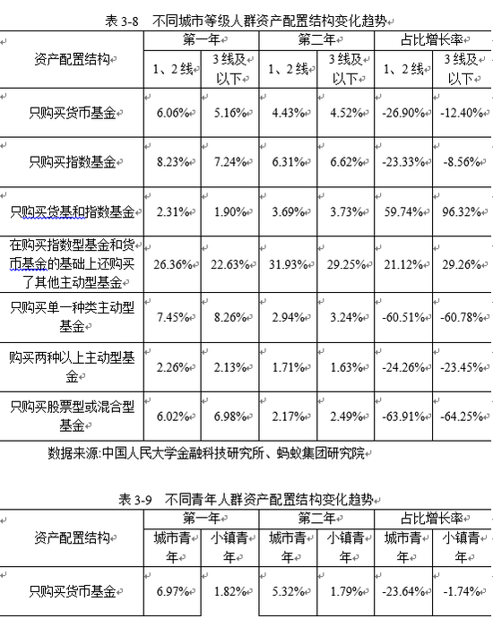 指数基金属于被动型基金,具有投资门槛低、对投资者金融知识与理财经验要求较低的特点。其他类型基金多属于主动型基金,盈利水平高度依赖于投资经理寻求超越平均水准的超值回报的能力。从表 3-7、3-8 和 3-9 中可以看出,相比第一年,第二年在购买被动型基金和货币基金的基础上还购买主动型基金的人数有所增加,表明人们主动配置理财产品、寻求超额收益的意愿有所增强。其中, 城市等级较低人群和涉农人群在购买被动型基金和货币基金的基础上还主动配置理财产品意识的增长速度要快于城市等级较高和城市的人群,并且小镇青年主动配置理财产品意识的增长速度要快于城市青年。