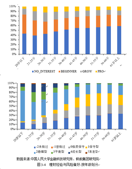 如图 3-4 所示,不同年龄人群的理财经验分布差别不大,但风险等级分布呈