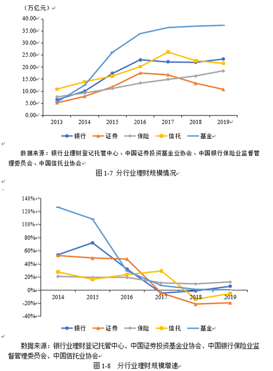 我们在借鉴《中国资产管理行业发展报告(2018)》、《中国财富管理发展指数报告(2019)》等研究的基础上,充分考虑当前我国财富管理的行业发展特征,选取银行业、证券业、保险业、信托业和基金业等五个维度,从整体与分行业两个层面来刻画我国理财行业近年来的发展情况。