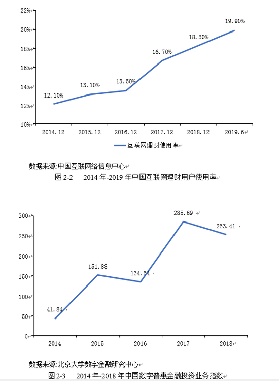 与传统理财产品相比,随着大数据、人工智能等技术不断成熟,互联网理财产品优势更加凸显。互联网理财产品具有交易门槛更低、透明度更高、交易操作更便捷,能够更大程度满足居民对于理财的个性化、多样化需求等特征,不仅能够有效拓展理财市场规模,而且深刻影响着传统线下理财方式,改变着居民理财观念。近年来,随着互联网覆盖人群范围进一步扩大,互联网理财市场规模和用户数量均有大幅增长。中国互联网络信息中心数据显示,截至 2019 年 6 月,我国购买互联网理财产品的网民数量已达 1.69 亿,占全国网民人数的 19.9%(见图2-1 和图 2-2)。北京大学数字金融研究中心、上海新金融研究院和蚂蚁集团共同编制的“数字普惠金融投资业务指数”反映了居民个体参与互联网理财的发展趋势。如图 2-3 所示,2014 年-2018 年投资业务指数整体处于快速上升趋势,2018 年投资业务指数大概是 2014 年的 6 倍。